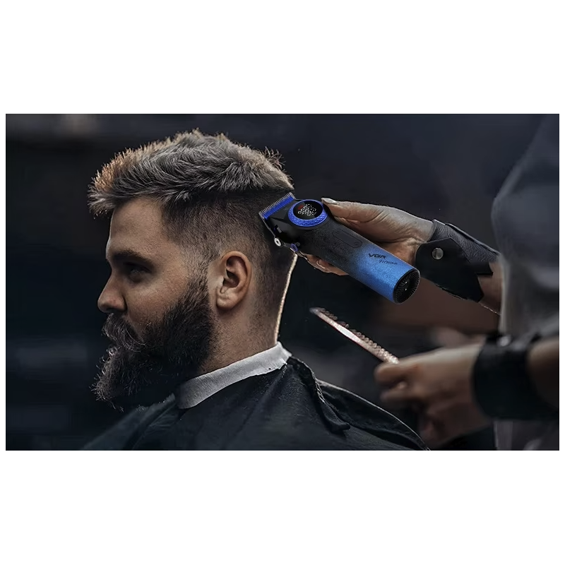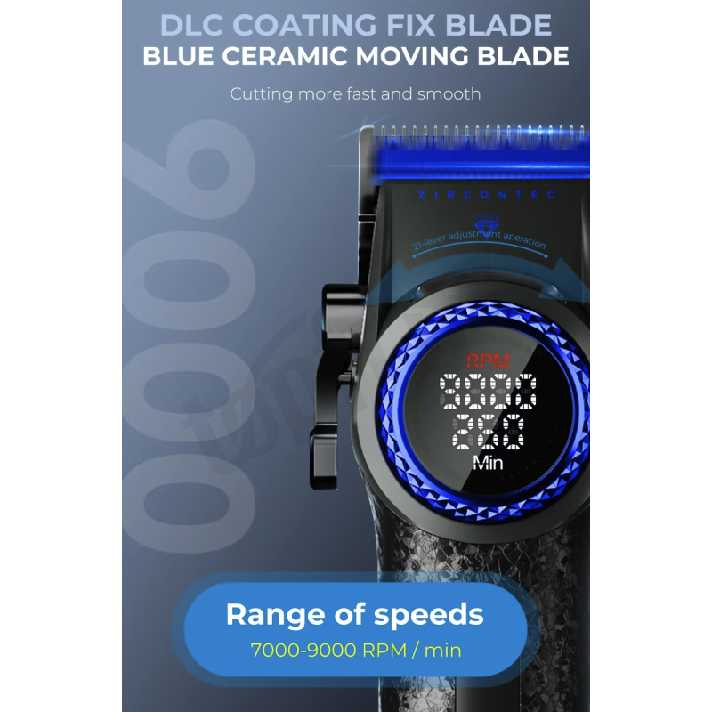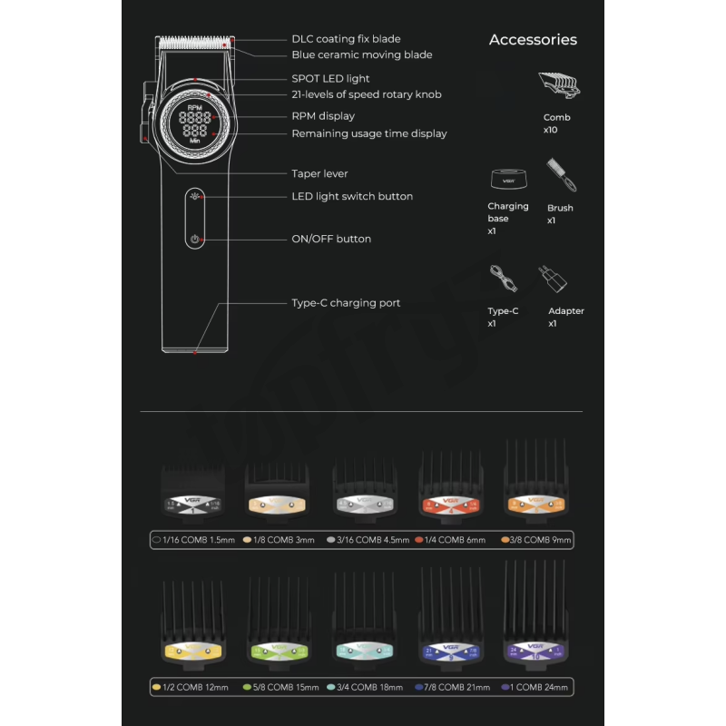 5 pozycji dźwigni Szybkie ładowanie 5V 2A = 3godziny Wyświetlacz LED wskazujacy stan baterii oraz obroty silnika W zestawie 10 nasadek dystansowych: 1.5/ 3 / 4,5 / 6 / 9 / 12 / 15 / 18 / 21 / 24mm Stacja ładowania lampka LED która pomaga przy cieniowaniu fade oświetlając strzyżoną powierzchnię